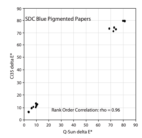ASTM Subcommittee D01.57 on Artists’ Materials conducted a study to determine the correlation between various exposure methods on a series of 15 colored artists’ pencils. Although the study also included outdoor exposures under glass, for this paper we will only focus on a comparison of the results from a Q-Sun and an Atlas Ci35. (For a full discussion of the data, including correlation to outdoors, see Brennan & Everett, 2000). Three manufacturers participated in the study. Each prepared two replicate specimens of five different colored pencil types. Each pencil type was applied to a replicate paper substrate. To provide a representative spread in the data, the specimens provided by the manufacturers were of various colors and durability levels, ranging from very good to very poor. Exposures: The specimens were exposed in a Q-Sun and in an Atlas Ci35 in accordance with ASTM D4303, Standard Test Methods for Evaluating Lightfastness of Artists’ Pigments, Method C (see Appendix for a description of exposure conditions). Instrumental color measurements were performed before and after exposure in accordance with ASTM E 1349 and D 2244. The tester/filter configurations were: 1.) Q-Sun Xenon Test Chamber, with Window Glass filters 2.) Atlas Ci35 Weather-Ometer with Borosilicate S inner and Soda Lime outer filters.